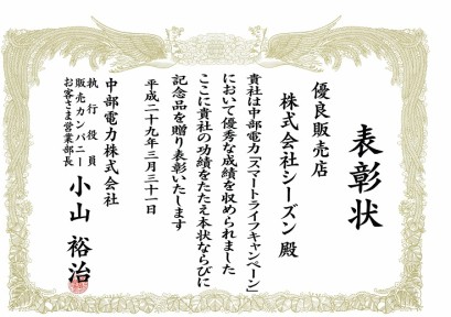 3年連続 中部電力より優秀販売店に表彰されました 株式会社シーズン リフォーム エコキュート 太陽光発電 Lpガス